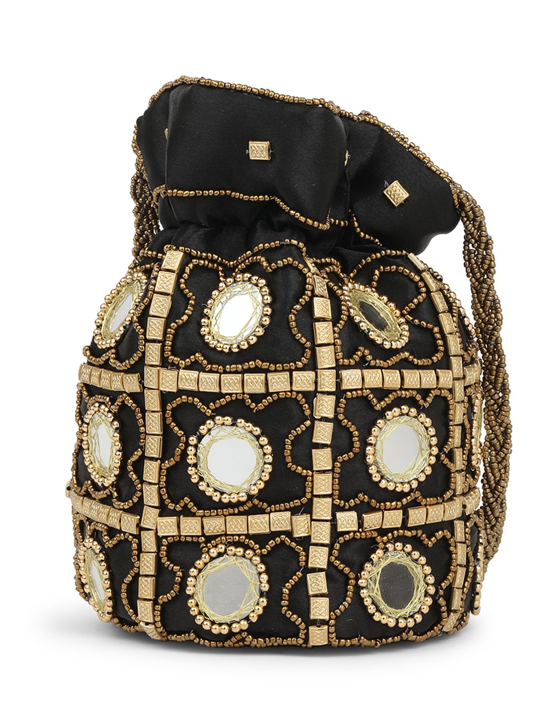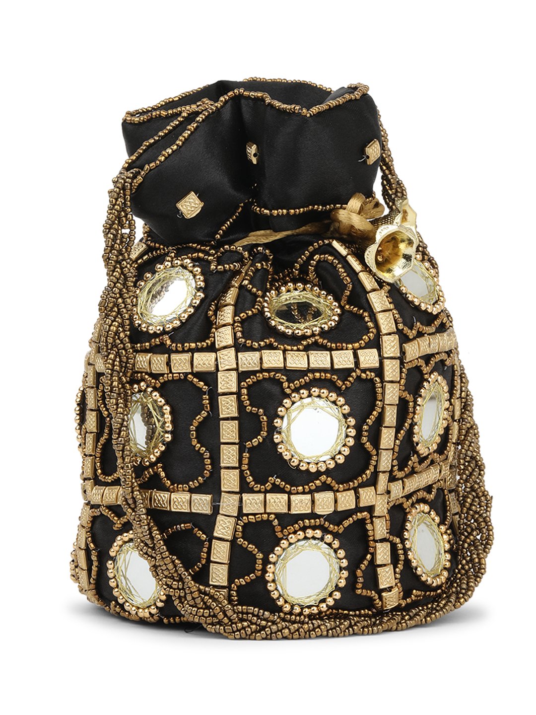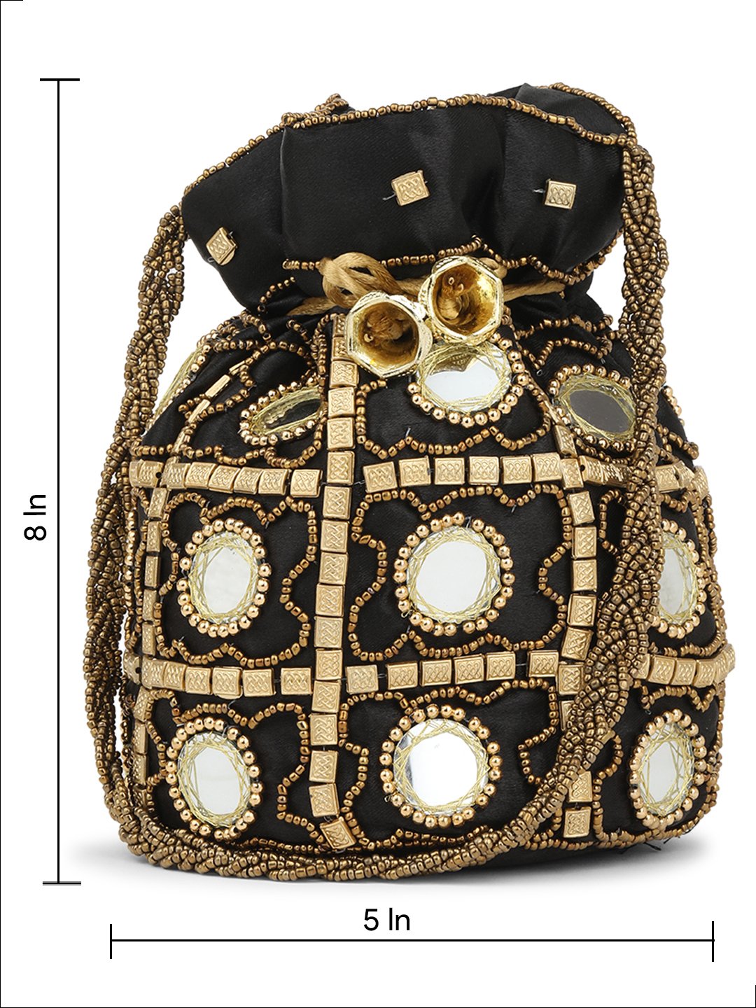 Black and gold-toned embellished potli clutches Has wrist loop 1 main compartment with drawstring closure Size & Fit Length 8Inches Depth 2Inches Width 5Inches Material & Care Fabric Wipe with clean, dry cloth