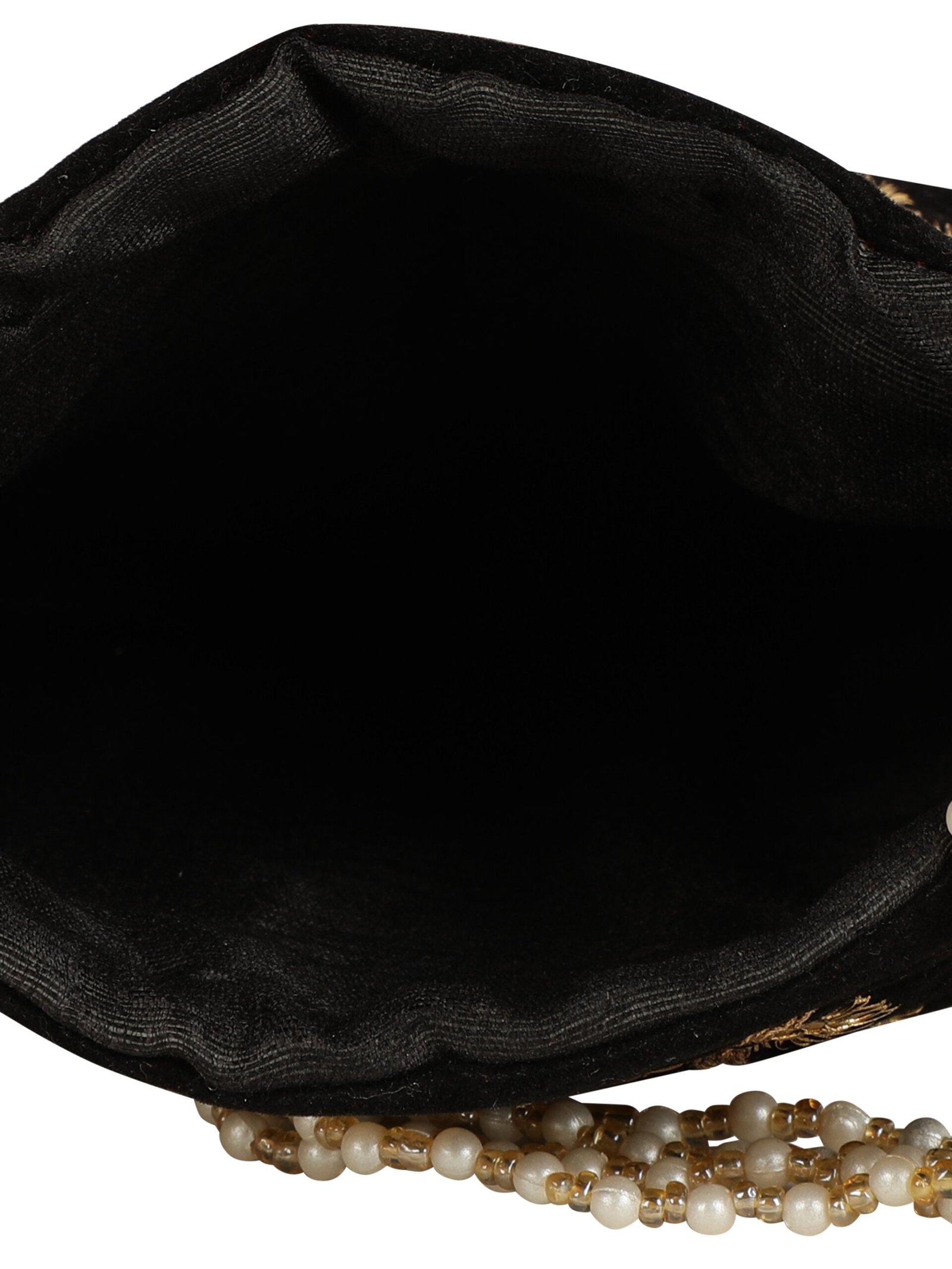 Black and gold-toned embroidered potli clutches Has wrist loop 1 main compartment with drawstring closure Size & Fit Height: Width: Depth: Material & Care Wipe with clean, dry cloth